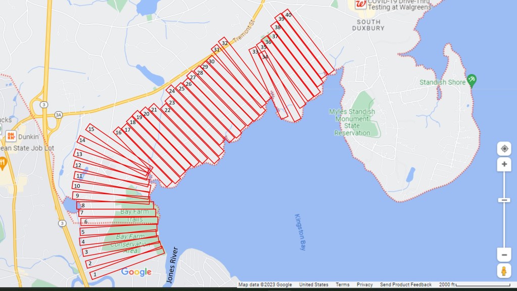 The map above is one conceptual approach to considering the distribution of approximately 800 acres of land to the west of Kingston Bay [as described for the process of the division of land in 1627]. Using these equal rectangular shapes, laid approximately next to one another along the shoreline, we can make a first approximation of the approximate location of where land would have been allocated to the firstcomers, based on information available as to relative position of neighbors. This can further be combined with what is known from analyzing the ancient deeds for lots in this vicinity along with eventual layout of streets over time. It must be remembered that the above map is simply a first approximation of relative location of where lots may have been laid out in the initial distribution [following the 20 acre methodology as provided in 1627]. The next step is to come up with the most likely order of the distribution of land (from south to north), combined with the number of shares which each Purchaser would be entitled, in order to approximate one possible location for each of the series of lots along Kingston Bay in the vicinity of Duxbury. The primary objective is to attempt to identify the approximate location (relative position) of the original grantees for the first approximately forty lots containing twenty acres – or approximately 800 acres [consisting of approximately 2.5 miles of shoreline to a depth of approximately 0.5 miles].