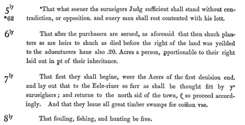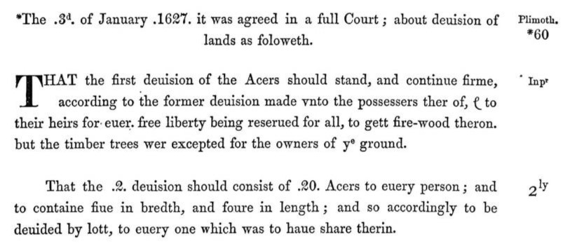 At around the same time as the 1627 Division of Cattle, the Plymouth Colony began the Second Division of Land. Each of the Purchasers was eligible to receive 20 acres per member of their family. For example, Single men would receive a single 20 acre lot, although a man with a wife and two children would receive an 80 acre lot.