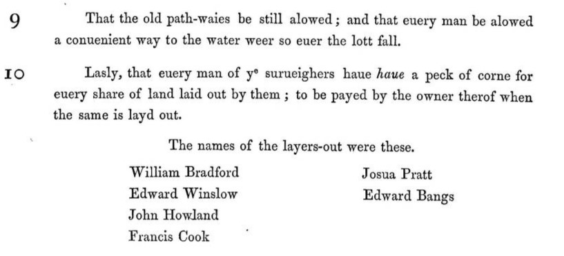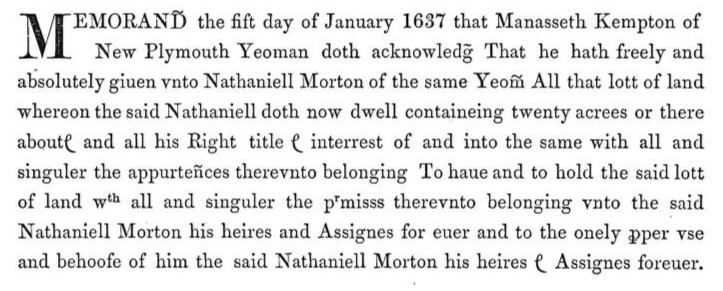 Manasseth Kempton transferred 20 acres to John Faunce and 20 acres to Nathaniel Morton in January 1637. Manasseth Kempton and Julian Kempton were members 8 and 9 of the 11th company and eligible to have received two 20 acre lots in the 1627/8 Division of Land. Thus, the 20 acres transferred to John Faunce and 20 acres transferred to Nathaniel Morton would have been adjacent to one another.