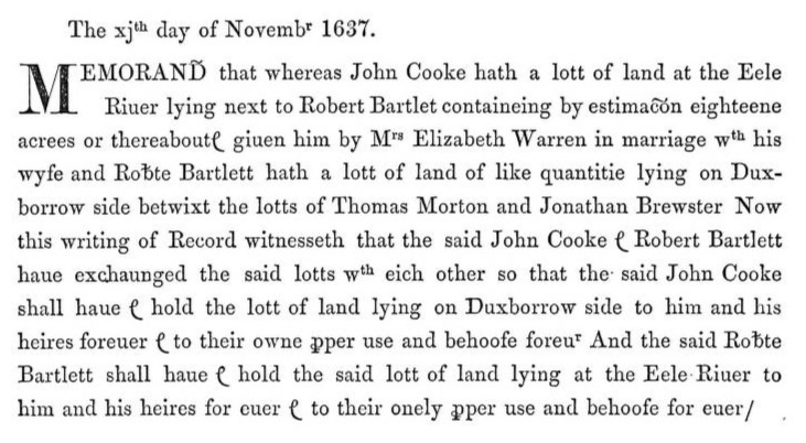 Thus, we can identify that Robert Bartlett received 20 acres [original grant as a Purchaser], transferred it to John Cooke in November 1637 and then John Cooke transferred it to George Partridge in August 1639. When Cooke acquired the property it was described as being between lands of Jonathan Brewster and Thomas Morton. When Partridge acquired the property it was described as being between lands of Comfort Starr and Thomas Morton. This can be explained by the deed in which Jonathan Brewster sold his 80 acre lot to Comfort Starr.