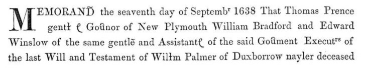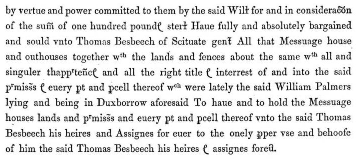 The Duxbury land originally granted to William Palmer was sold during the probate on his estate to Thomas Besbeech. William Palmer would have likely been granted 60 acres as members 8 thru 10 of company 7. This information helps us in seeking the location by looking for other clues based on the subsequent owner [Thomas Besbeech] combined with the suspected size of the lot [60 acres].