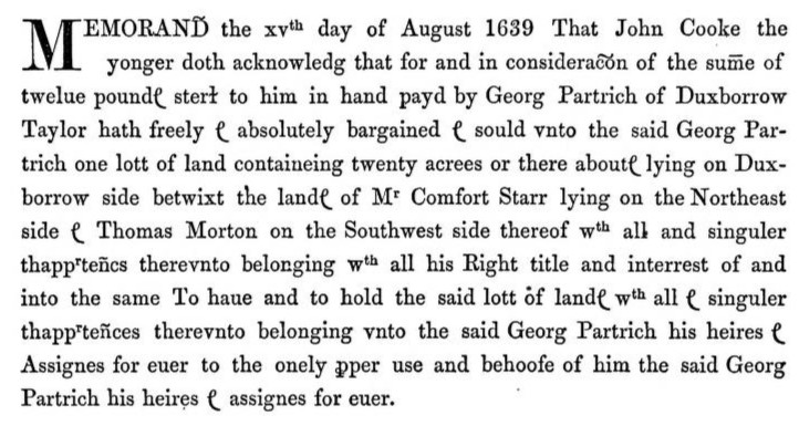 Further, John Cooke sold this lot to George Partridge. This deed identifies the 20 acres as being between Comfort Starr and Thomas Morton.