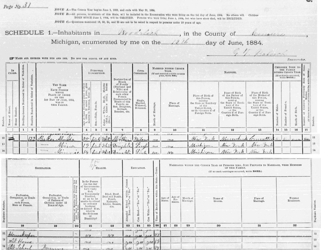 Almeda (Pratt) Baker (age 55, born in New York) and two of her daughters, Mina (age 19, born in Michigan) and Minnie (age 14, born in Michigan), were enumerated in the 1884 Michigan Census living in Woodstock, Lenawee County, Michigan on June 12, 1884. Almeda identified that her father was born in Massachusetts and her mother was born in Connecticut and that she had lived in Michigan for 51 years. This tells us that Almeda likely came to Michigan with her parents in about 1833 [1884 – 51 = 1833] at the age of about four [55 – 51 = 4].
