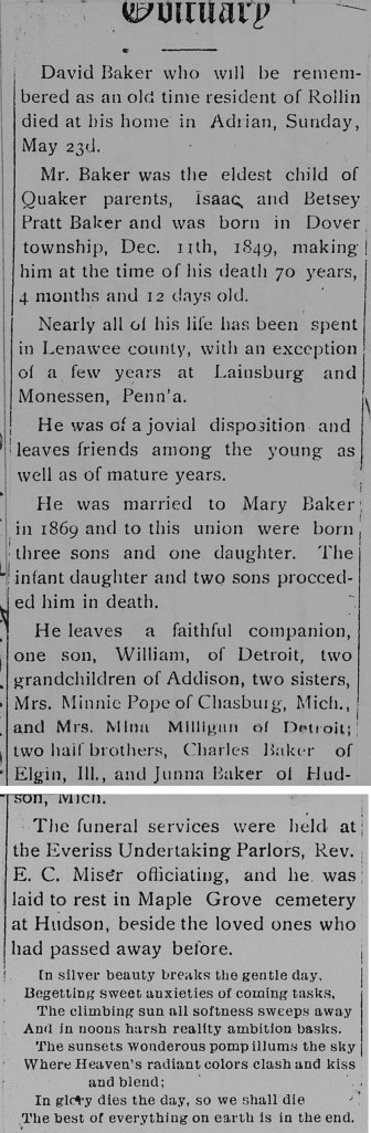 The obituary for David Baker, born on December 11, 1849 and died on May 23, 1920, identifies his parents as “Quakers” Isaac and Betsey Pratt Baker; and two surviving sisters as Mrs. Minnie Pope and Mrs. Mina Milligan.