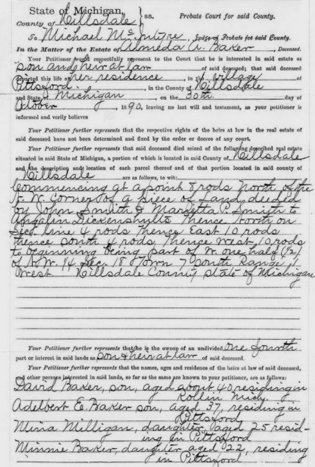 The Probate Court for Hillsdale County, Michigan received information regarding the heirs of Almeda (Pratt) Baker on October 30, 1890. The heirs were identified as (1) David Baker, son, aged about 40, residing in Rollin, Michigan; (2) Adelbert E. Baker, son, aged 37, residing in Pittsford, Michigan; Mina Milligan, daughter, aged 25, residing in Pittsford, Michigan; and Minnie Baker, daughter, aged 22, residing in Pittsford, Michigan.